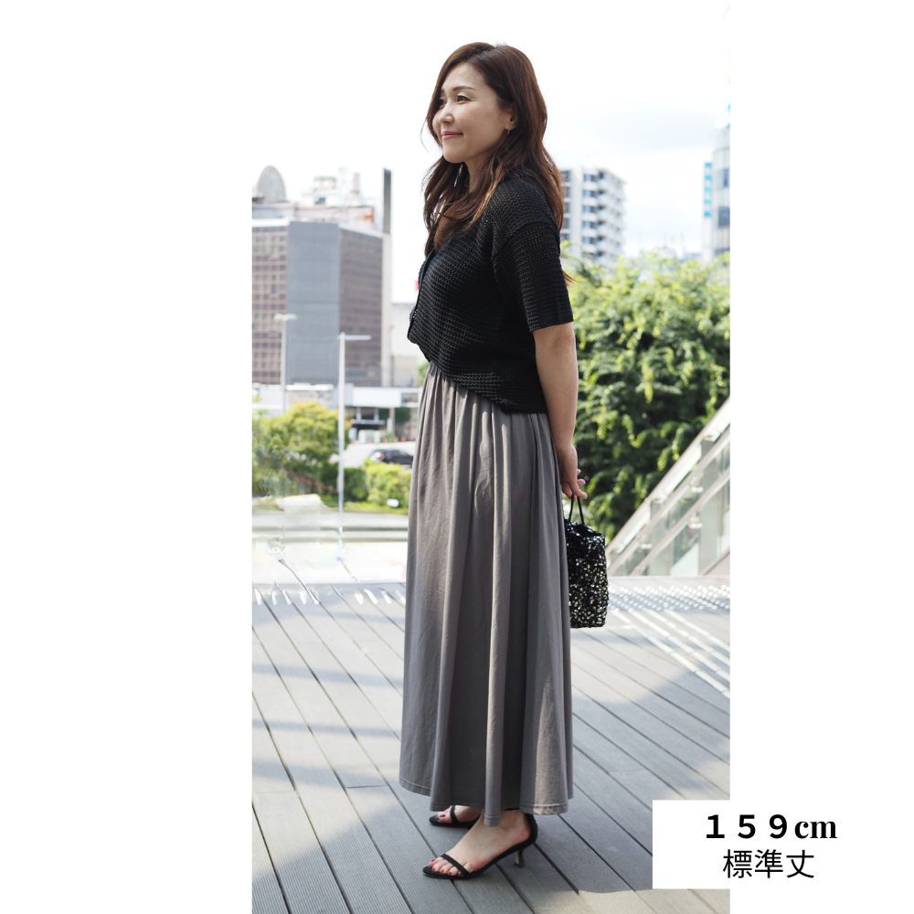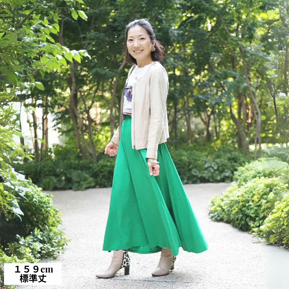 身長158cmで標準丈ですと、くるぶしがちょうど見えるくらいの丈になるので、階段などは少し腰のあたりを摘んで裾を上げながら歩く工夫が必要だったが、他は丈感として問題無かったです。