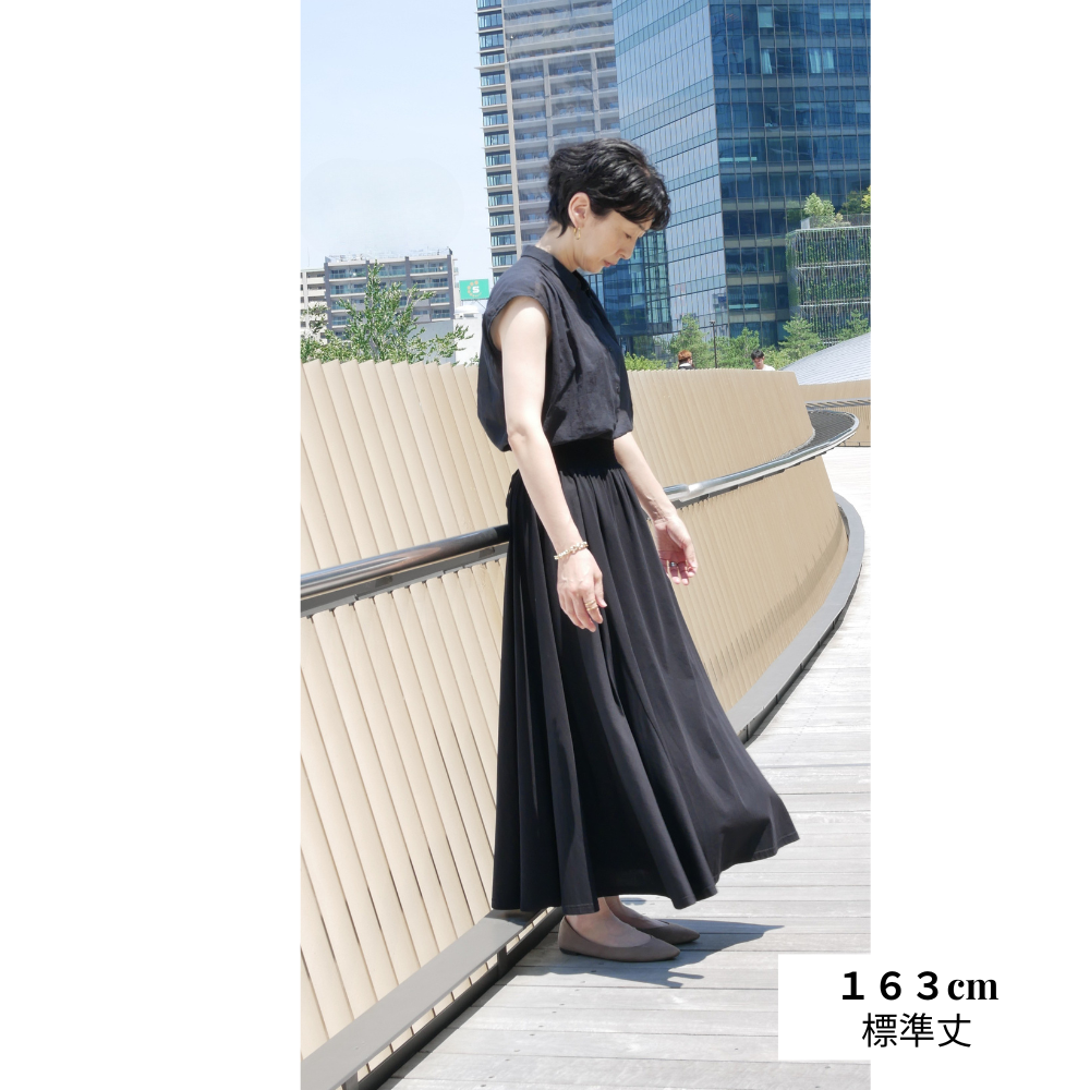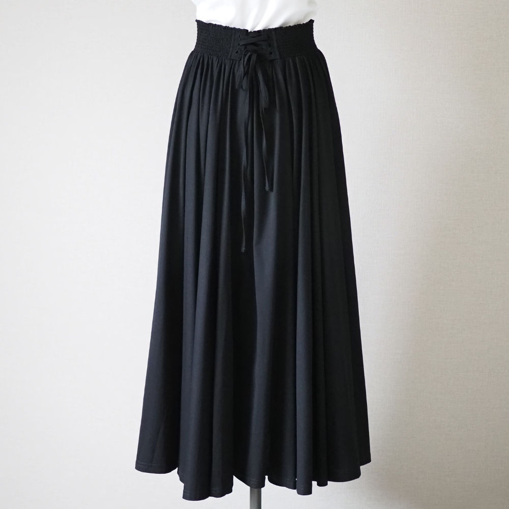 色が黒でロングフレアースカートなので履いたとき重たいかもしれないと思っていましたが、想像していた以上に、履き心地が軽く、サラッとしていて、綿100とは思えない光沢感がありました。