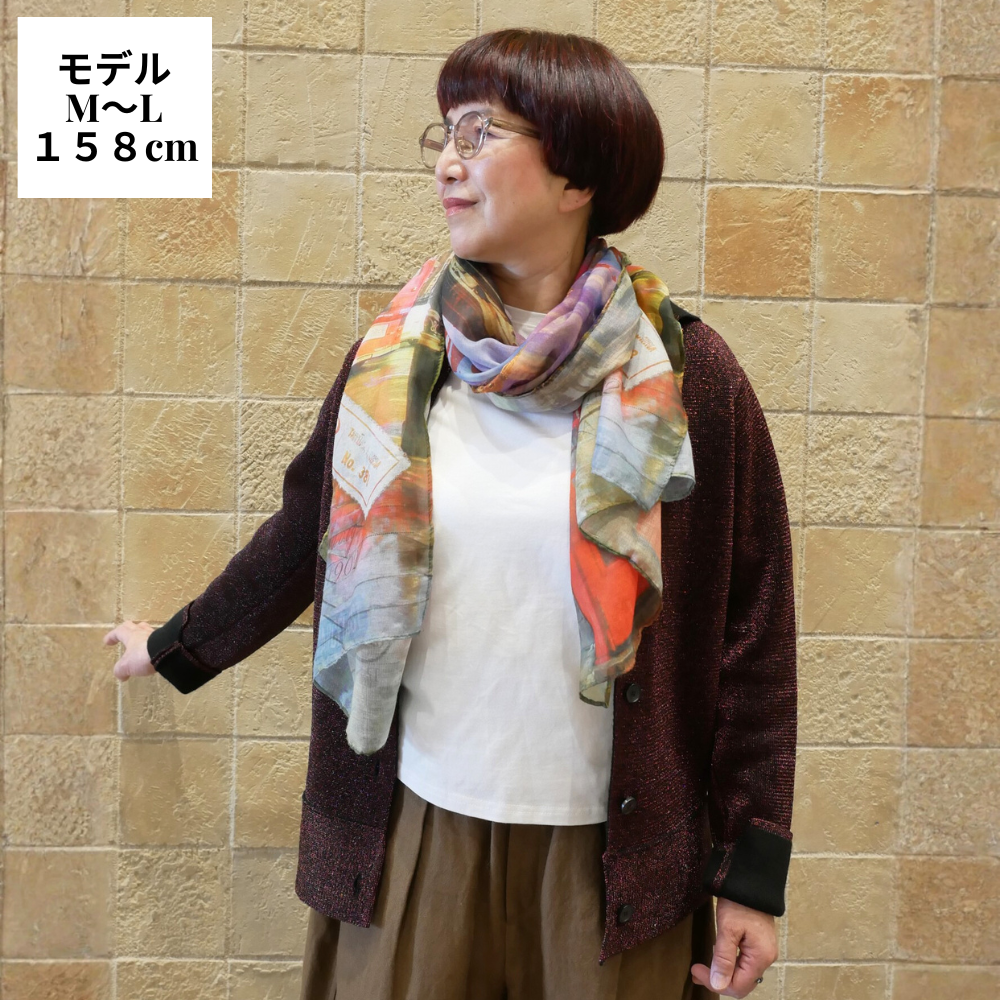 薄くて軽いので周りの質感、季節を問わず使いやすい、ストールとして肩にかけても、マフラーとして首に巻いても上品に映えます。(特にマフラーのように巻くと顔に紫色が来てとてもきれいです)